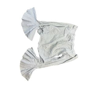Dramatic, architectural, and unmistakably Jacquemus — this “La Reconstruction” blouse is a true showstopper. Crafted from crisp blue-and-white striped cotton, it features an off-the-shoulder neckline and exaggerated fluted cuffs that add instant flair.