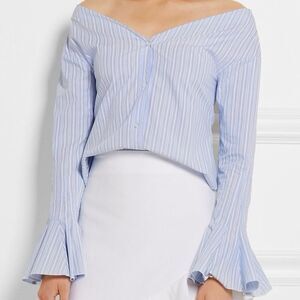 romantic blouse, off-shoulder top, French designer, fluted sleeves, cotton shirt, summer blouse, statement sleeves, minimal chic, striped blouse, architectural top, Jacquemus aesthetic, fashion week style