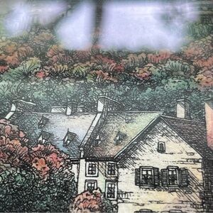 -this is an etching that is colored with mineral and semi-precious stone pigments. The roof on a few of the buildings in image have sparkle from the semi-precious stones.