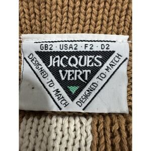 This Jacques Vert Vintage Camel Brown White Stripe Jewel Peacock Knit Sweater in size 2 is a stylish and unique addition to any wardrobe. Made of 100% cotton in a tight-knit fabric, this sweater features long sleeves and a round neckline, making it suitable for various occasions such as travel, casual outings, and workwear. The peacock jewel accents add a touch of elegance to the sweater, which is perfect for the fall and winter seasons. With its vintage appeal and preppy style, this pullover sweater is sure to stand out in any collection.