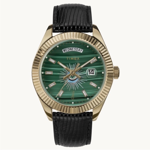 Elegant Timex watch with a gold case. Features a striking green dial. Black leather strap. Day and date windows included.