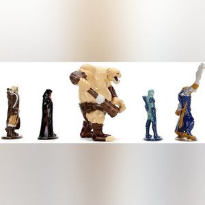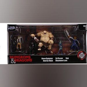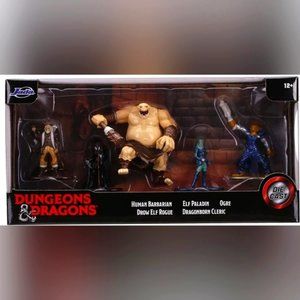Jada Dungeons & Dragons Die Cast Metal Figures Set of 5. These tabletop figures are die-cast and approximately 1.65 inches each in height. Included are human barbarian, elf paladin, ogre, drow elf rogue anjd dragonborn cleric. New in box. Ages 12+
