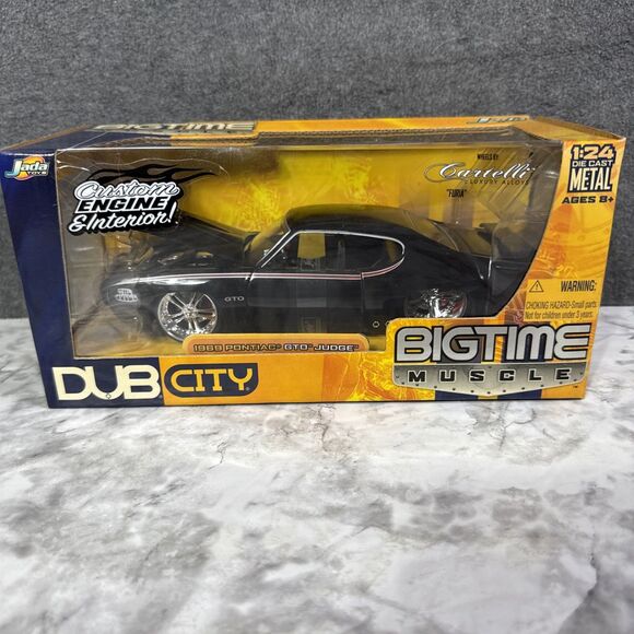 The Jada Toys 1/24 Dub City Bigtime Muscle 1969 Pontiac GTO Judge in black is a die-cast model car perfect for collectors and enthusiasts. This 1:24 scale replica of the iconic 1969 Pontiac GTO Judge features detailed craftsmanship and design. With the brand's reputation for quality, this model is sure to be a standout addition to any collection. The unopened box adds a sense of exclusivity and adventure to the toy vehicle, making it a great gift for fans of classic cars and die-cast models.
