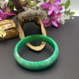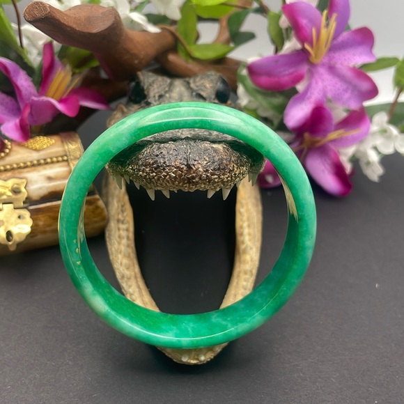 Stunning Jade bangle greens and milky whites fits a size 7.5 wrist. Tested by the presidium.