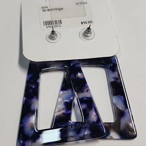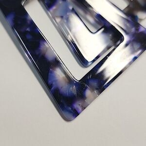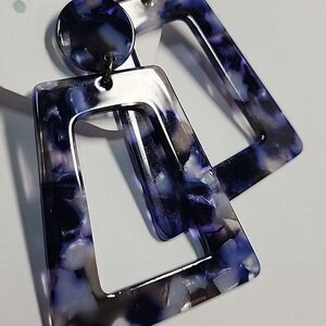 Bold statement earrings with a geometric design. Features a mix of purple and black hues. Perfect for adding a pop of color to any outfit.