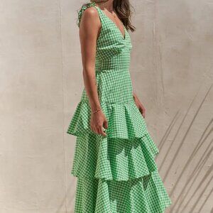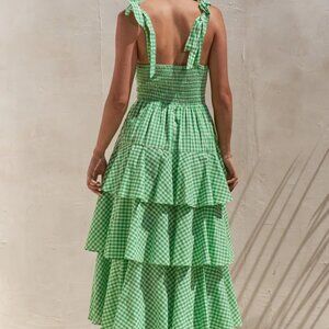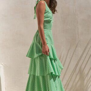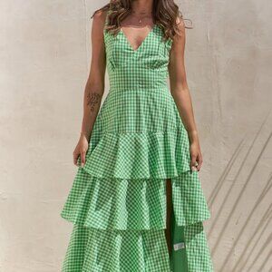 *This charming Jade By Jane midi dress features a timeless green and white gingham check pattern in a lightweight, breathable cotton blend fabric. The sleeveless design showcases a flattering V-neckline with decorative button accents, while the empire waist flows into cascading tiered ruffles that create beautiful movement. A daring thigh-high front slit adds modern appeal and ease of movement. Perfect for summer picnics, beach vacations, or garden parties, this versatile dress combines vintage-inspired gingham with contemporary design elements. The midi length offers elegant coverage while remaining breezy and comfortable in warm weather.