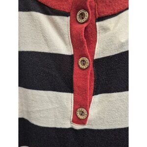 This tunic, with its harmonious black and white stripes, interwoven with vibrant red accents, feels like a narrative of bold elegance. The 7 inch button down if you want to wear it this way adds a quaint touch, making it a subtle yet striking piece. The loose fit ensures comfort, while the long sleeves offer warmth, creating a blend of style and practicality.