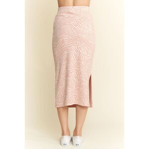 This sophisticated midi skirt features a chic zebra print pattern in soft pink and white tones. Made from a stretchy, comfortable fabric that hugs the body in all the right places. The high-waisted design and side slit detail create an elongating effect while maintaining elegance. Perfect for both casual daytime looks when paired with sneakers, or dressed up for evening events. The material provides excellent shape retention and comfort throughout wear. Suitable for all seasons and various styling options.