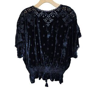 Jade Johnny Was Silk Blend Velvet Embroidered Top With Tassel Tie, Size Small