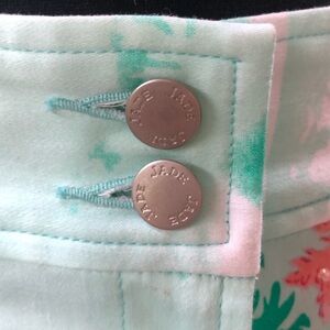 Jade Melody Tam Casual Skirt Sea Shells, Starfish & Coral Allover Print. White with Greens, Pinks & Coral with Beaded Accents. A Line Silhouette. Double Button Zip Fly Closure. Two Back Pockets.