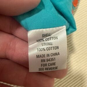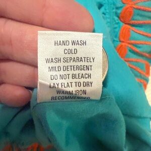 Bright and breezy embroidered tank top by Jade Melody Tam. Features a turquoise blue cotton shell with bold orange embroidery, elastic waist detail, and full cotton lining for comfort. Perfect for casual summer wear, vacation, or festivals.
