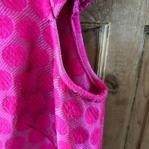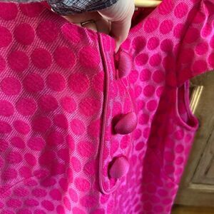 Features: Super cute pink polka dot dress. Three buttons on middle front. Shift style. Side pockets on either side. Back zipper. Knee length. Capped Sleeves. Completely lined.