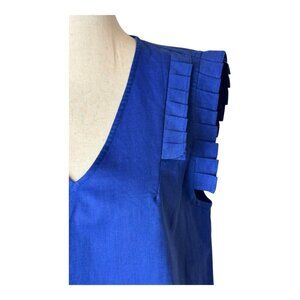 This elegant sleeveless top features a vibrant royal blue hue, pleated ruffle shoulders, and a V-neckline, offering a polished and refined look.