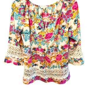 Jade Women's Bold Floral Pullover Top Crochet Accents Size XS