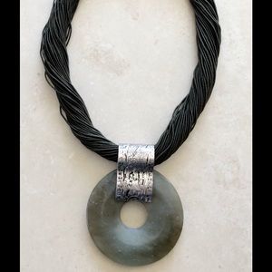 Unique large circular green jade necklace. Jade is 2 3/4 x 2 3/4 inch in size the silver is hand hammered in a Chinese motif. The cord is dark green hand rolled silk cording. The clasp area is a large jade bead. I purchased this in a boutique while in China. Very unique. Comes with a silken pouch.
