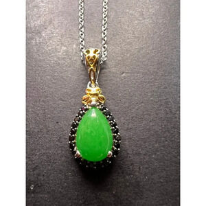 Green treated teardrop shaped Jade stone surrounded by tiny black spinel accent stones. Two toned setting with gold and platinum plated over sterling silver. Chain measures 18 inches in length. Jade stone glows under UV light due to the color treatment. STS 925