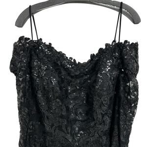 • Features: Black, Sequin Embellished, Mesh Elbow Length Sleeves, Solid Black Skirt, Spaghetti Strap