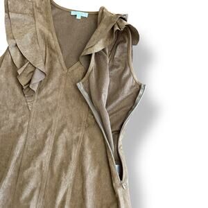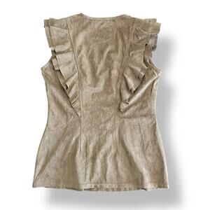 Jade by Melody Tam sleeveless top, size XS. Faux suede finish in camel tan with feminine ruffle cap sleeves. Side zipper closure and V-neckline.