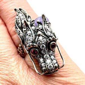 This Jade of Yesteryear women's ring is beautifully crafted with sterling silver, incorporating a dragon design with a purple jade centerpiece and ruby eyes. The ring is size 6, weighing 9 grams.