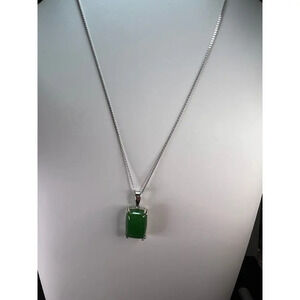 Rectangle cut dyed green jade stone. Prong set in platinum plated over sterling silver. Chain measures 20 inches. Total ctw 16.50. 925