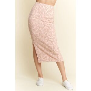 This sophisticated midi skirt features a chic zebra print pattern in soft pink and white tones. Made from a stretchy, comfortable fabric that hugs the body in all the right places. The high-waisted design and side slit detail create an elongating effect while maintaining elegance. Perfect for both casual daytime looks when paired with sneakers, or dressed up for evening events. The material provides excellent shape retention and comfort throughout wear. Suitable for all seasons and various styling options.