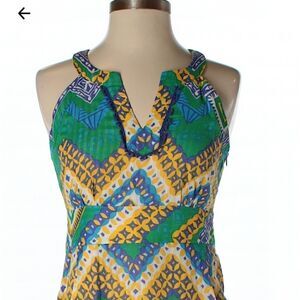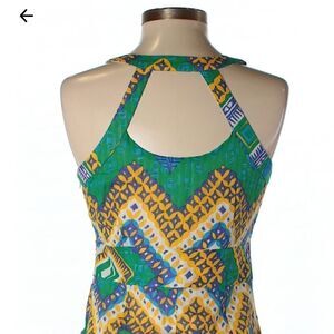 Colorful cotton sheath with cut out back, knee length , lined, side zip, pockets in great condition. See pics for more info