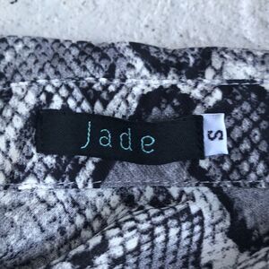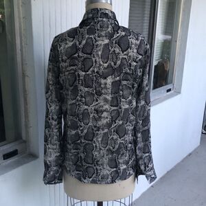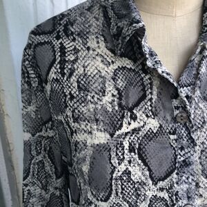 Super cute snake print cotton poly blend . Across the shoulder seam to seam is 15, pit to pit is 20, from the top of the shoulder to the bottom is 25. Measurements are approximate.