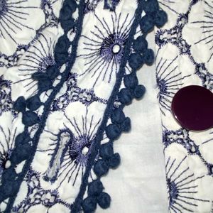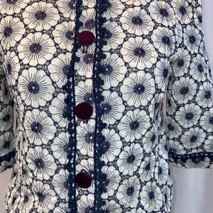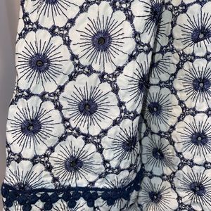 White with embroidered navy blue floral print by Melody Tam. The size tag was cut out so please look at measurements. It measures to a small.