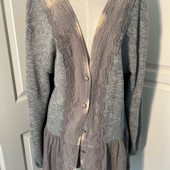 This elegant gray cardigan features a delicate lace trim, perfect for adding a touch of sophistication to any outfit. Ideal for layering, it combines comfort with style.