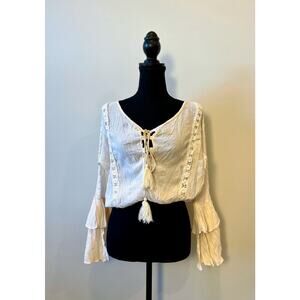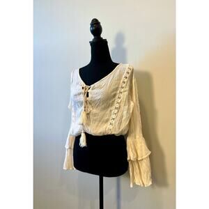 Jaded Gypsy WC Crop Top in White OS Long Sleeve Tasseled Tie Front Embroidered