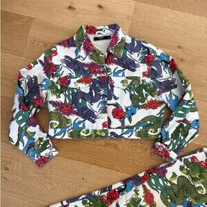 Jaded London - Dragon Print Mom Jeans & Crop Jacket in White Red & Green