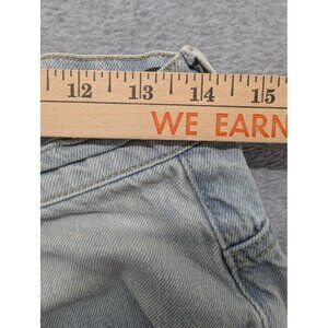 Condition: Good pre-owned condition. Natural fading and wear throughout. Raw cut/frayed hems. Small dark mark on leg shown in photos. No holes noted beyond intentional raw hems; please review images for details.
