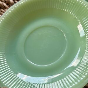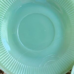 4 Charming jadeite green saucers by Fire King. 3 of the saucers have the ray pattern on the bottom side, one is plain on the bottom. All have the ray pattern on the top side. One saucer has 3 very small chips as noted in the picture. 3 saucers have a very faint anchor with an “H” in the anchor for Anchor Hocking. The other saucer says Fire King in the middle of the words oven and glass. If you collect Jadeite glass or Fire King, these have your name on them! Thanks for looking!