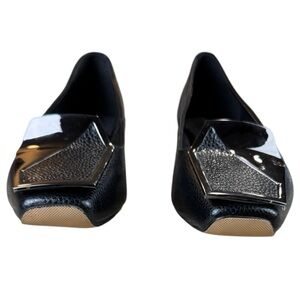 Meet Rosalyn — a statement-making pair of designer loafers that blend modern edge with timeless sophistication. Crafted from black textured leather, these shoes feature a striking front embellishment combining pebbled leather and deep dark chrome for a bold yet refined look. The transparent lucite crystal block heel adds an avant-garde touch that catches the light from every angle. Perfect for elevating both workwear and evening ensembles, they’re the versatile luxury your wardrobe has been waiting for.