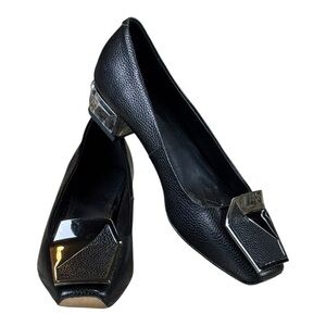 • Features: Textured pebbled leather, geometric dark chrome & leather front embellishment, transparent lucite crystal block heel, square toe design