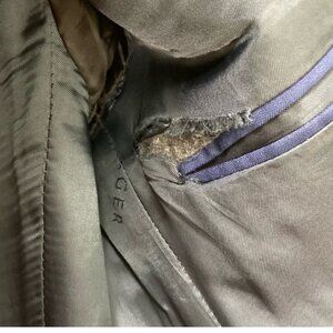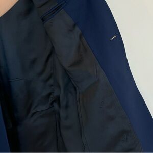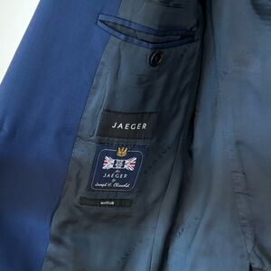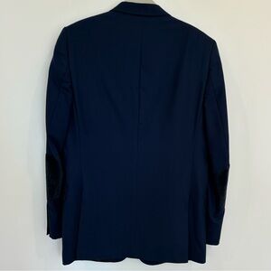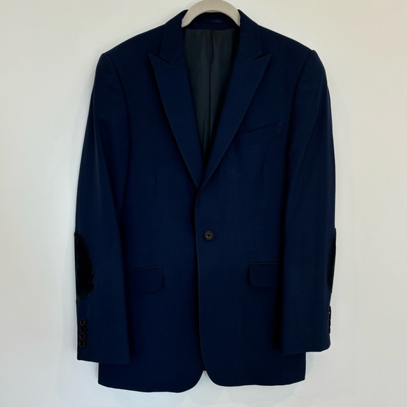 Made in the United Kingdom with custom suede elbow patches. This blazer is in excellent condition aside from a small tear on the interior of the lining.