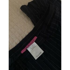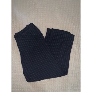 Elevate your style with these classic navy blue and white pinstripe pants. Perfect for any occasion, these pants offer a timeless and sophisticated look. Material is 99% wool, 1% polyester. High waisted. Made in Great Britain. Size 14 US.