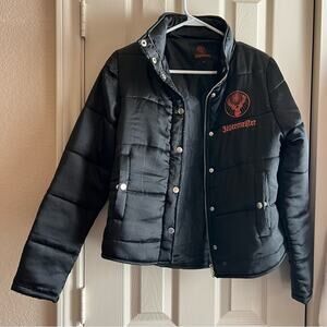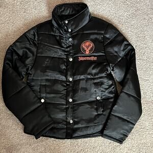 Jaegermeister puffer jacket coat, satin, embroidered, zip and snap front Sm