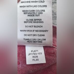Color is a burnt orange/red or faded red. Button and zipper closure. Total of 6 pockets.
