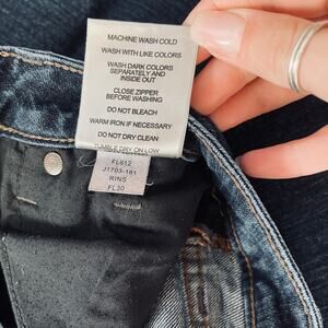 This pair of denim has a low rise waistband with a bootcut leg. Details include silver hardware with a front zipper, and two front and back pockets. Both back pockets have embroidery detail.
