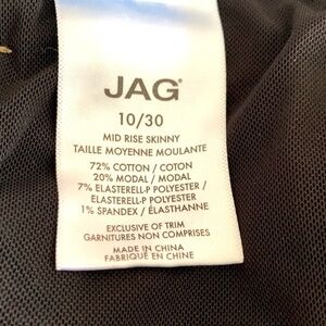 Jag Mid Rise Skinny Jeans w/5 pockets. Size 10 w/Spandex and Elastane. Designed with an everyday mid rise and just enough room through the hip and thigh for comfort, this pair's also crafted in high stretch denim that has an authentic look while still delivering the all-day comfort and ease of movement you need. Great to wear year round. Excellent Condition.