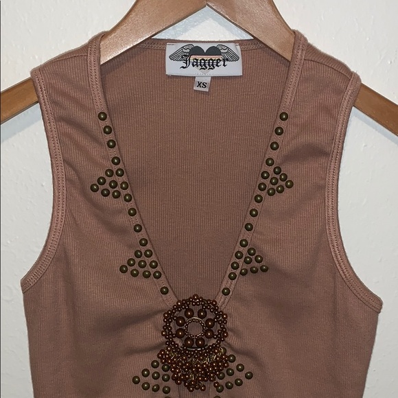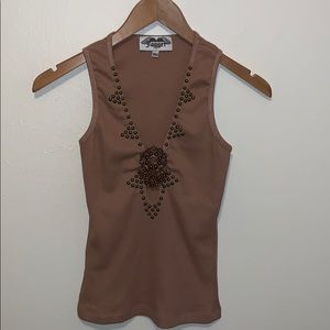 New without tags! Gorgeous jewel accent with metal studs. Deep v neck, sleeveless tank top. Very figure flattering, sexy. 100% cotton. Pretty mocha color. 13 inches across chest and 21.5 inches long.