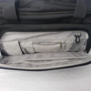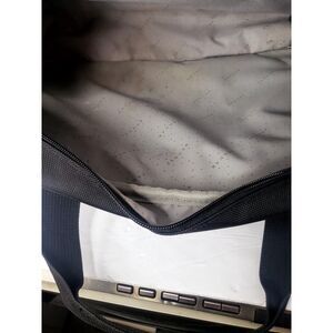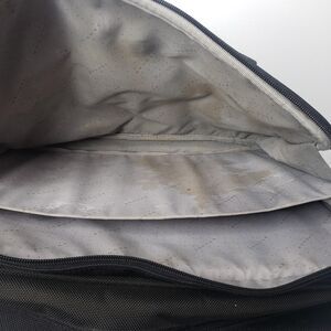Condition: Used - Good. Exterior shows light wear; interior lining and divider have visible discoloration and stains as shown; zippers function smoothly; no holes or tears seen; shoulder strap not included.