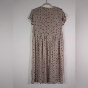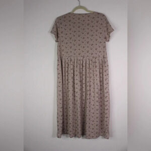 Jaju Korean Floral Tan Beige Midi Dress in Size Small (Korean size 95). Made from soft cotton with a delicate allover floral pattern, this dress features short sleeves, a gathered waist, and a comfortable midi length. The neutral tan-beige tone and simple silhouette make it perfect for casual wear, spring styling, or a soft cottagecore aesthetic.