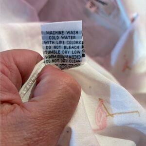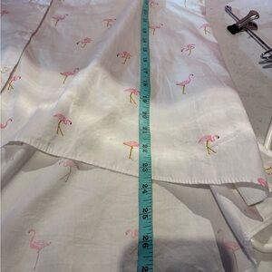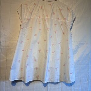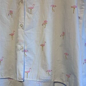 Stylish white shirt with pink flamingo design. Ideal for casual wear.
