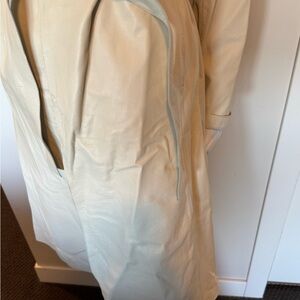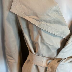 Fabulous lightweight leather trench with detachable belt. I am selling it in the crème color way, but I added pictures on a model in the same jacket in black for reference. It’s amazing!