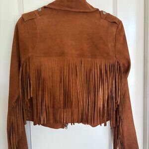 Brand New with Tags, Tina Suede moto jacket in cloud-soft washed suede, shrunken fit with fringe detailing at sleeve and back