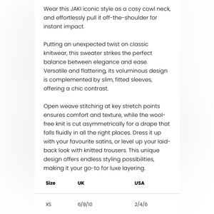 Excellent condition. Only flaw is small tear at hem where pictured from materials/care tag removal. Very soft and stretchy viscose blend. Can be worn off the shoulder or as a cowl neck. Fitted sleeves, loose throughout.