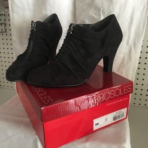 Black fabric, ankle boot-styled heel with zipper at front