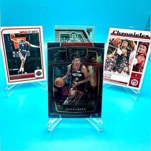 This 4-card lot features Jalen Green, a promising player from the Houston Rockets, and includes 2021-22 Panini Select Basketball Rookie Card, 2023-24 Panini Hoops Basketball Base Card, 2022-23 Panini Flux Basketball Blue, and 2022-23 Panini Chronicles Basketball Chronicles Card.